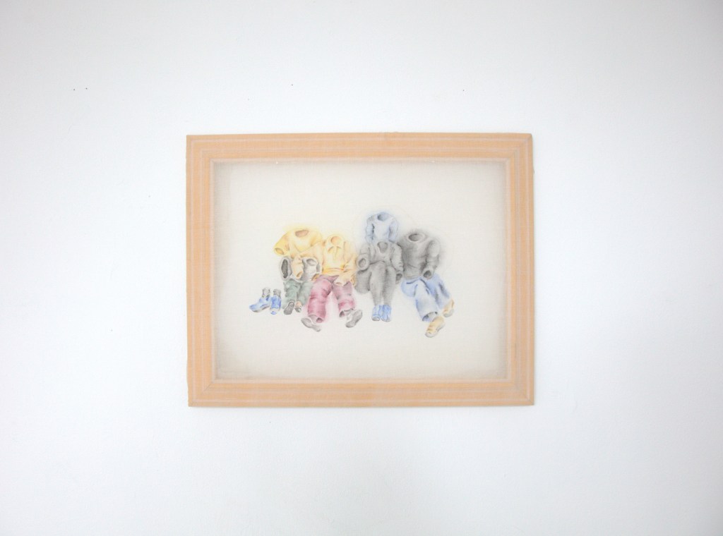 Cadres de famille, Série de peintures à l’aquarelle de portraits de famille déshumanisés sur des voiles tendus sur des cadres, 2024