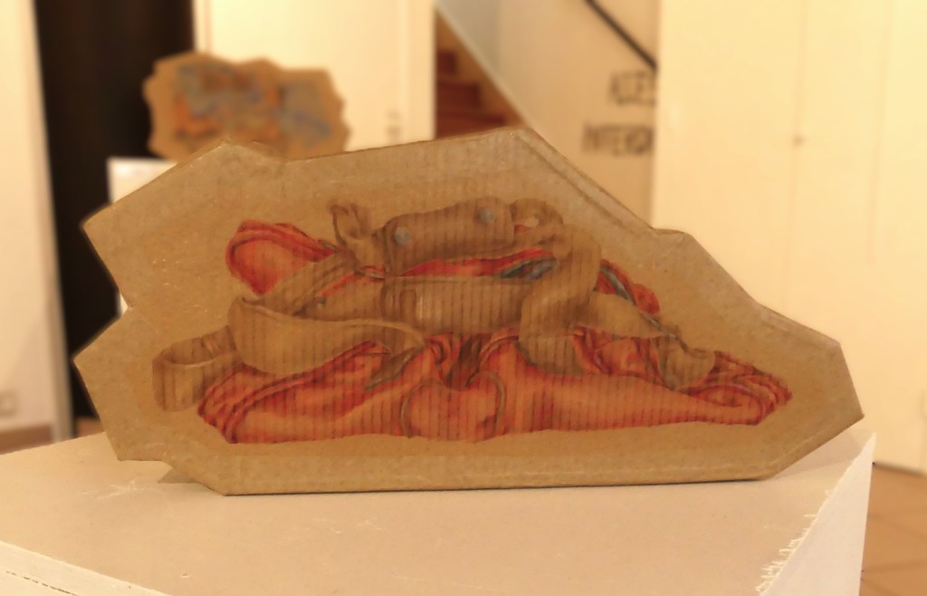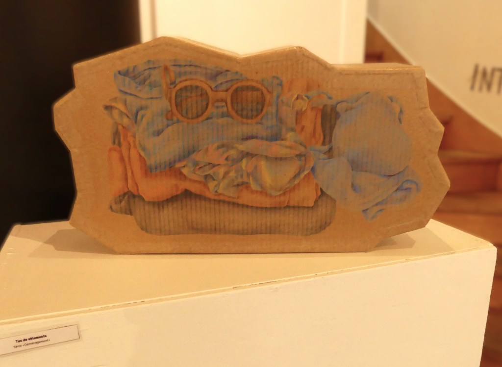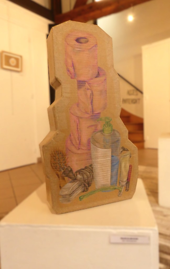 Série de volumes en cartons de déménagement avec des dessins aux crayons de couleurs, 2024